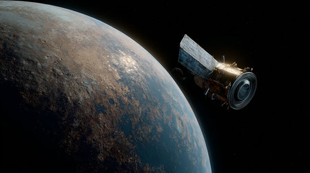 An illustration depicts a satellite in orbit around Earth, showcasing the planet's atmospheric features. The image presents a dark, space environment with the illuminated Earth. This visual could be used in projects related to technology, communications, or scientific research. The image displays a sense of innovation.