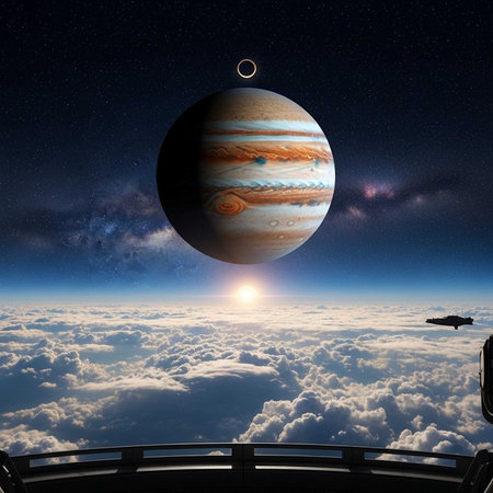 A stunning view of Jupiter from space with clouds and a bright sun in the background