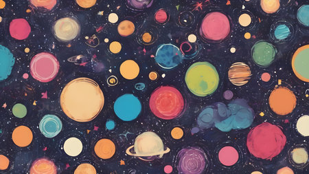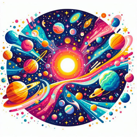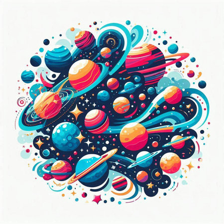 Vibrant illustration of colorful distant galaxy with planets and stars, AI generated