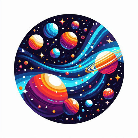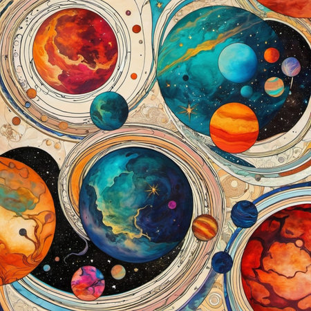 A digital illustration presents a detailed planetary system. Several planets, varying in size and color, are shown orbiting a central point. The artwork features a gradient of colors with detailed textures. The composition likely depicts an imagined space environment, suitable for scientific or educational material, or for artistic applications.