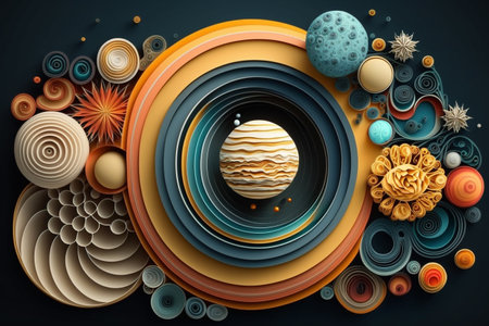 abstract paper quilling space, spacetime and constellations, stars and planets. Creative and beautiful patterns of celestial bodies. Sun, moon, earth