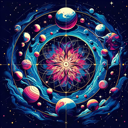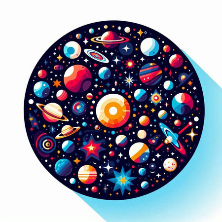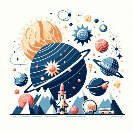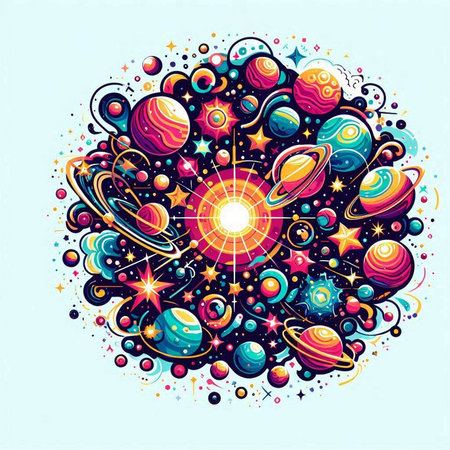 An artistic depiction presents celestial bodies including planets and stars. The illustration features a dark background, contrasting with bright gold and white elements. Circles and lines create an orbital design. This image could be used for various design projects, web content, or print materials.