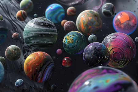 Colorful assorted spheres in space-themed arrangement with starry background.
