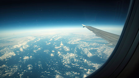 Plane wing visible through window with clouds and Earth's curve seen from high above in space-like perspective