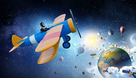 Woman pilot in helmet flying old styled airplane. Elements of this image are furnished by NASA