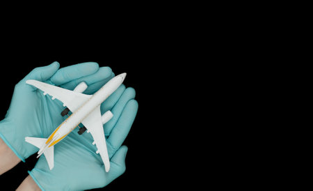 Hand in glove holding model airplanes on black background. Concept traveling. Copy space
