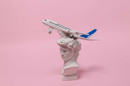 Travel, tourism or voyage concept. Model of a passenger plane with David bust on pink background