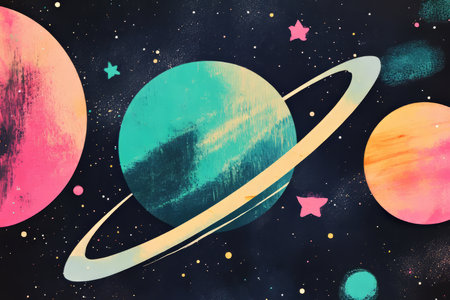 Two vibrant planets with rings and bubbles drift through a cosmic setting filled with color.