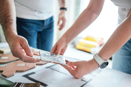 Hands of a male and female are engaged in a home renovation project, reviewing tiles and design plans on a table, emphasizing collaboration and design process