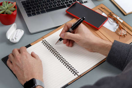 Overhead shot of male taking note on blank notebook on white office desk with computer device, camera and coffee cup