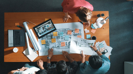 Top down aerial view of civil engineer hold project plan while design join meeting. Professional manager working together to design building construction while planning by using blueprint. Symposium.