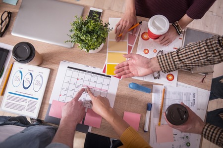 Important time. Delighted positive nice people standing around the table and pointing at the date while working together