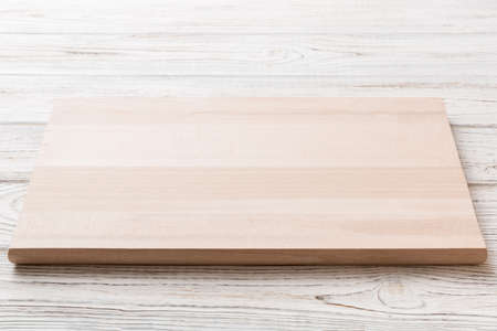 Perspective view of wooden cutting board on cement background. Empty space for your design.