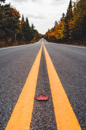 Low angle photography of a single fallen leaf on the asphalt road during canadian autumn