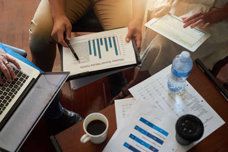 Cropped shot of two businesspeople brainstorming on their project with digital tablet and business charts on wooden table