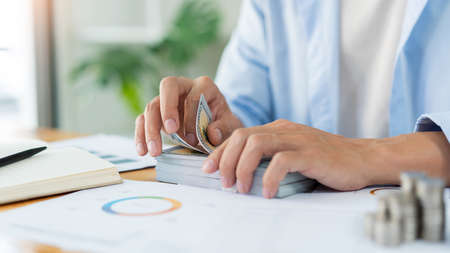 Businessman accountant counting money and making notes at report doing finances and calculate about cost of investment and analyzing financial data, Financing Accounting Banking Concept.