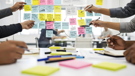 A group of people working together on a project, using sticky notes on a glass wall to brainstorm and organize their ideas. The scene is set in a modern office with a collaborative atmosphere.
