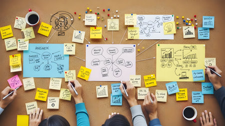 Engaging team planning session showcasing hands actively creating a flow chart with colorful sticky notes, emphasizing collaboration and strategic project management.