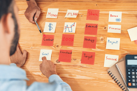 Business team gather on table, brainstorming and writing creative idea on colorful post-it notes. Planning and brainstorm strategy to achieve business targets. fervent