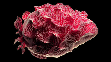 This stunning abstract 3D visualization features a pink and red organic form with an intricate mesh structure, set against a contrasting black background, showcasing beauty in design.