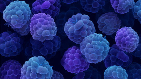 This vibrant abstract design features various shapes resembling microorganisms in shades of blue and purple, perfect for scientific, artistic, or technology-related projects.