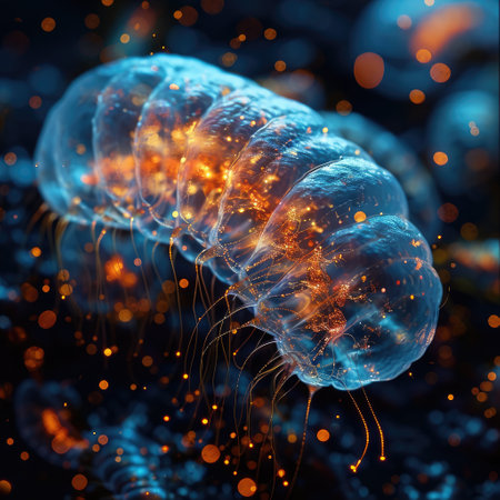 Close-up of a tardigrade walking on moss fibers, its glowing body showcasing its resilience in extreme environments
