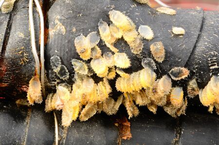 Closeup of a scale insect on tree bark with a bioengineered moss in a damaged orchard