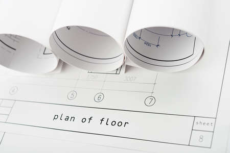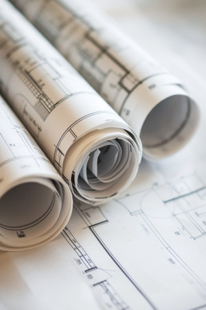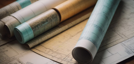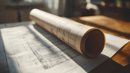 Rolled-up blueprint paper with detailed architectural drawings, perfect for construction or design concepts
