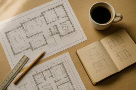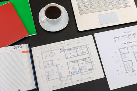 Architectural plans and sketches displayed on a desk with a cup of coffee nearby