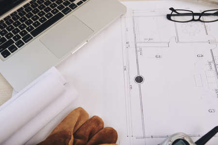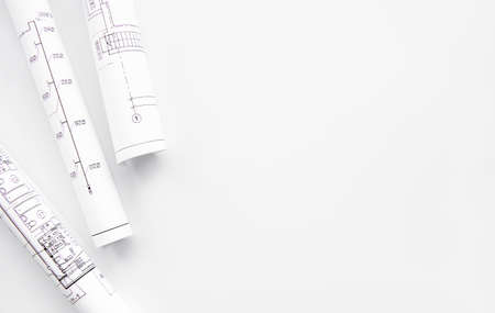 Architect workplace top view. Architectural project, blueprints, blueprint rolls on table. Construction background. Engineering tools. Copy space