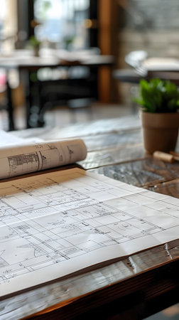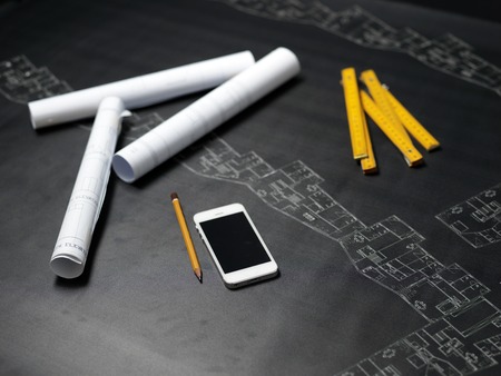 Architectural blueprints, blueprint rolls and a drawing instruments on the worktable