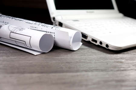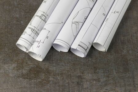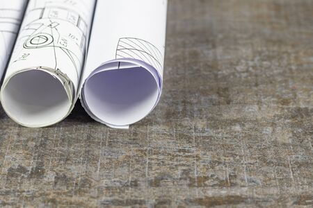 Rolled blueprints or architectural drawing paper view from a high angle. House plan blueprints rolled up. Building construction industry concept