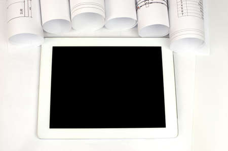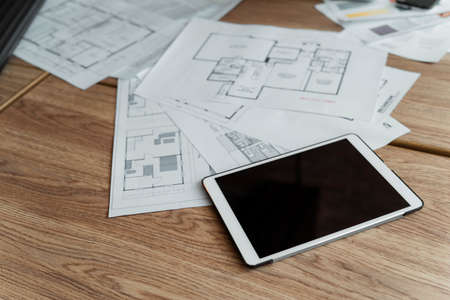 Cropped image of tablet and plan of architecture on the mess wooden table.