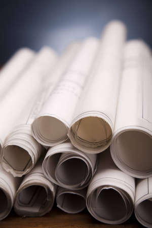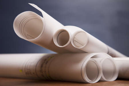 Architectural project, drawings on a dark background. Rolls of project drawings.