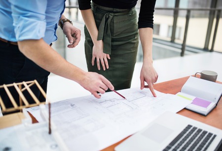 Two architects and engineers are in a meeting to discuss and inspect the house designs to meet the building and construction standards. Interior design and decoration ideas.