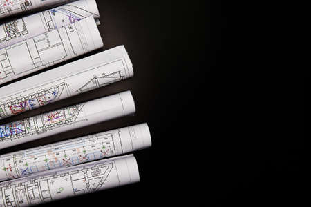 Rolled architectural blueprints and technical drawings on dark surface showing design details