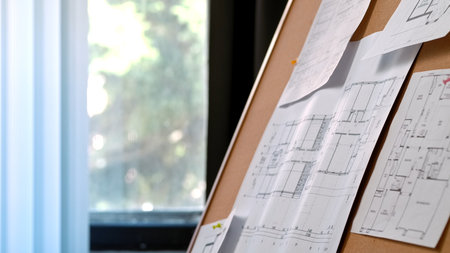 Architectural Plans Displayed on Wooden Board in Sunlit Room
