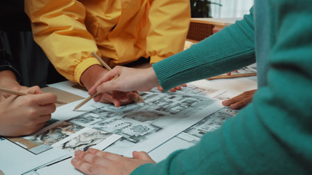 A vibrant scene of diverse individuals collaborating on storyboarding comic artwork. They are enthusiastically sketching and sharing ideas in a creative workspace. SACTR