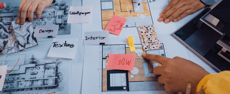 Top view of civil engineer team writing at blueprint at meeting table with color palettes. Group of smart diverse people planning and taking a note while manager looking at project plans. Symposium.