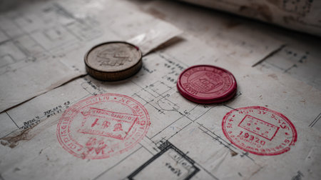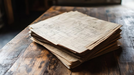Stack of engineering plans and blueprints spread across a wooden drafting table