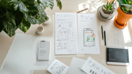 A vibrant creative workspace showcasing design sketches, greenery, and technological tools, perfect for inspiring innovation and productivity in modern project development.