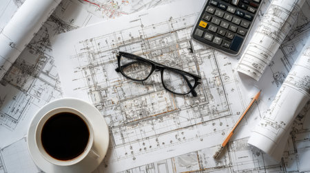 A top-down view of architectural plans displayed alongside a cup of coffee, glasses, calculator, and pencil on a worktable, perfect for design and planning projects.