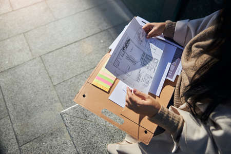 Close up of businesswoman holding sheet of paper with architectural plan while working on project outdoors