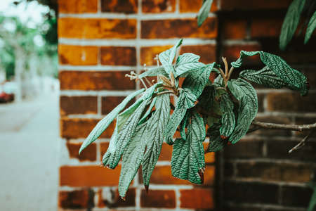 A selective focus of the beautiful Leatherleaf viburnum plant's patterned leaves