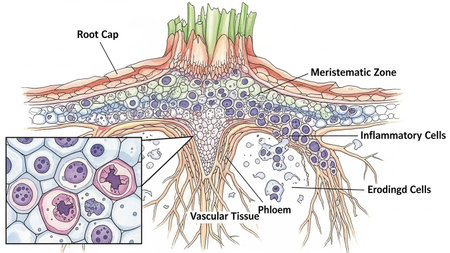Detailed illustration of a plant root tip, showing meristematic zone, vascular tissue, and inflammatory cells.