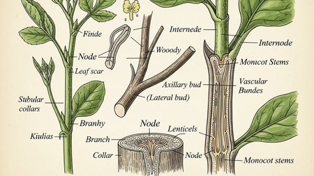 A detailed botanical illustration showing the structure of a plant stem with various parts labeled.