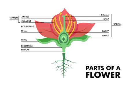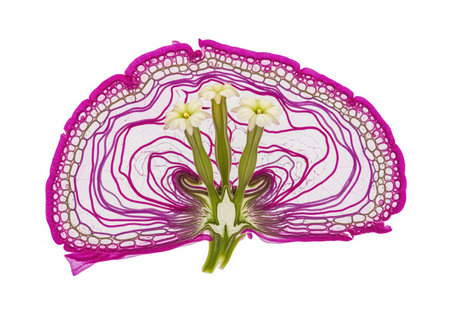 Detailed botanical cross section displaying the internal cellular structure of a plant organ, highlighted by vibrant magenta staining and central white flowers.
