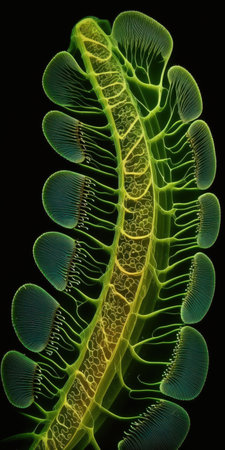 Detailed illustration of a leaf structure highlighting intricate veins and cellular designs in vivid green hues, suitable for educational, scientific, and artistic projects.