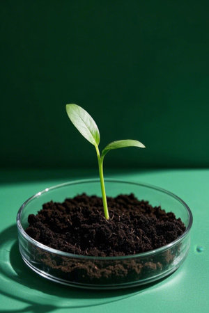 Close up of biologist's hand with protective gloves holding petri dish with soil and young plant. Microscope in background. Biotechnology, plant care and protection concept