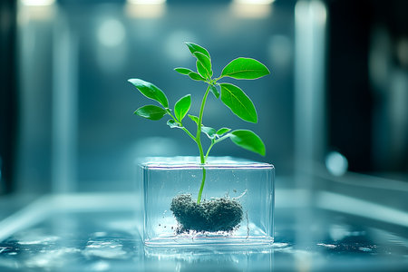 Green plant growing in transparent cube with rich soil. Bright artificial light enhances growth in contemporary indoor garden. Concept of horticulture, indoor farming, plant care.